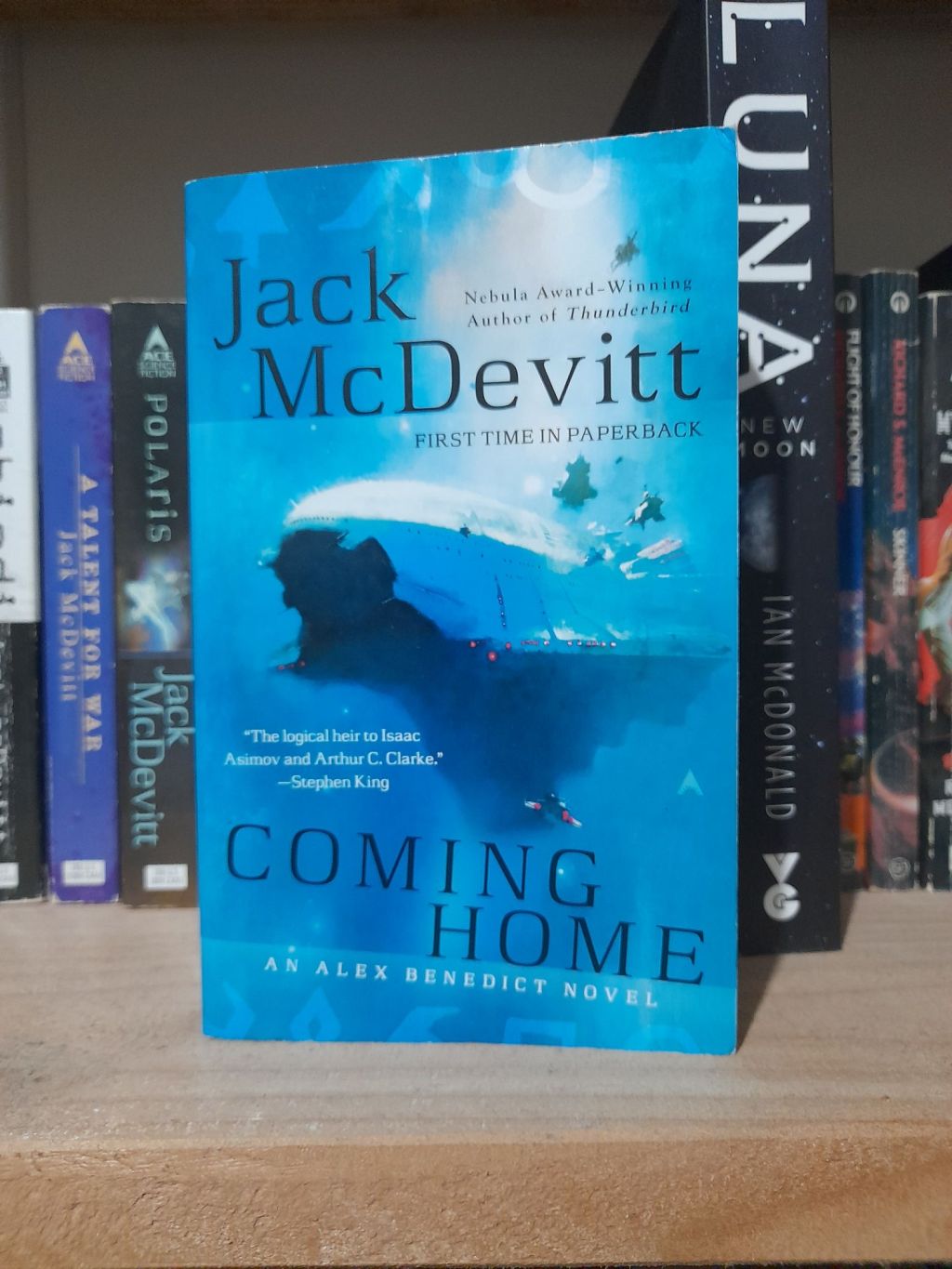 McDevitt has always been very good at weaving the real and the unreal. Look at the epigraphs of each chapter. Sometimes you’ll find Shakespeare. Sometimes a Romantic poet. Sometimes an extract from a novel that doesn’t exist. Sometimes details on the lives of people who won’t be born for thousands of years. Coming Home takes things to the next level. The Apollo missions play a key role (unfortunately, I fully believe that lunar vandals would be willing to steal Neil Armstrong’s footprints), but alongside this we have references to Mars missions, and the first crewed voyage to Saturn. Of course, at a remove of several thousand years (including an unfortunate Dark Age) history and myth become muddled, especially in the absence of concrete proof. There’s a brilliant section that muses on the historical identity of characters such as Dracula (presumably a blood doctor of some kind) and Sherlock Holmes (a clear influence for the narration-by-sidekick approach this series takes).